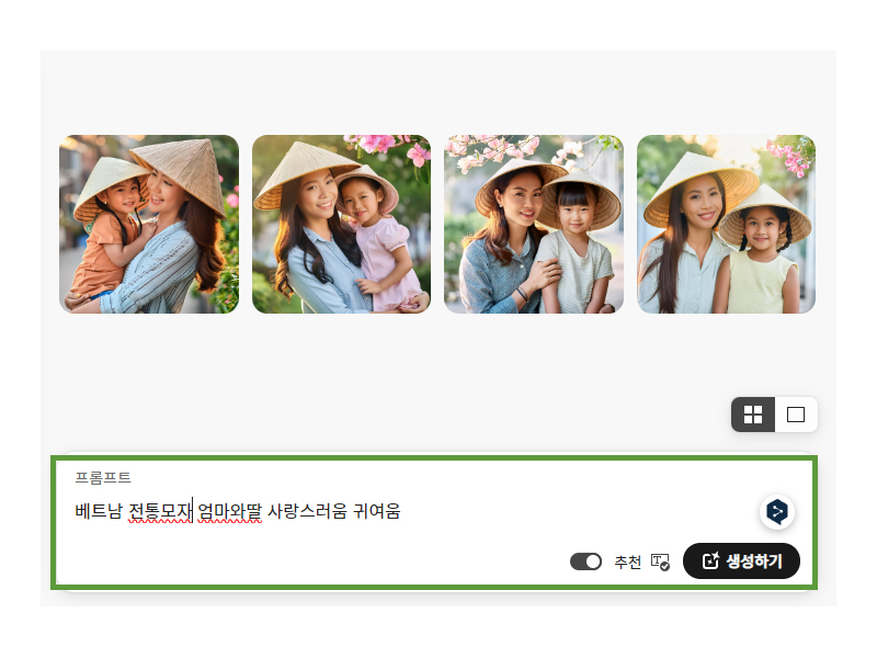프롬프트에 '베트남 전통모자 엄마와딸 사랑스러움 귀여움' 을 입력하여 생성하기를 눌렀더니 총 4가지 이미지가 뜹니다.