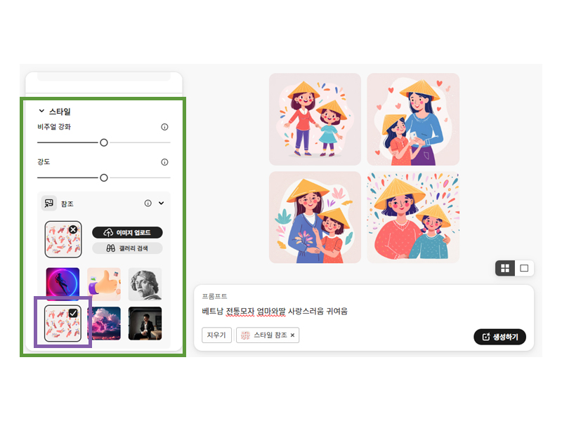 왼쪽에서 스타일 이라고 적힌 부분을 찾아 참고할 만한 이미지를 선택하고 다시 생성하기를 누릅니다.